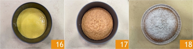 En este punto, hornea en un horno estático a 180° durante 45-50 minutos 16. Siempre haz la prueba del palillo antes de sacar el pastel del horno 17. Deja templar, luego desmolda tu pastel sin gluten y espolvorea con azúcar glas 18!