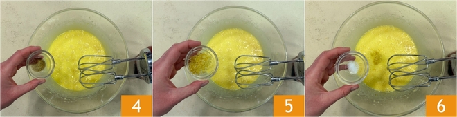 Añade el extracto de vainilla 4, la ralladura de limón 5 y una pizca de sal 6.