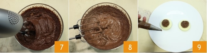 Una vez que la crema esté bien fría, con una batidora eléctrica montad la mezcla 7 hasta que se vuelva cremosa y densa 8 (tomará al menos 10 minutos). Ahora que vuestra crema ganache está lista, vertedla en una manga pastelera equipada con boquilla estrellada y decorad la superficie de los pastelitos de chocolate blanco con un copete de crema 9.