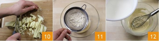 Ahora dedicad vuestra atención a la crema clara, haced clic aquí para consultar la ficha de la Crema pastelera de chocolate blanco: cortad en escamas el chocolate blanco con un cuchillo 10 y reservadlo, verted en un bol la leche condensada y añadid la harina tamizada 11. Calentad la leche en un cazo a fuego bajo, luego añadidla en hilo a la mezcla de harina y leche condensada, mezclando con una varilla para evitar que se formen grumos 12.
