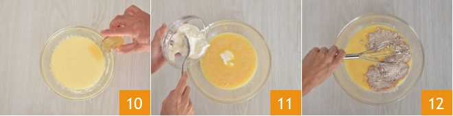 el bourbon 10 y el yogur griego, y mezcle todo junto 11. Ahora puede incorporar también la mezcla de polvos, vertiendo aproximadamente la mitad, y mezcle con el batidor teniendo cuidado de no formar grumos 12.