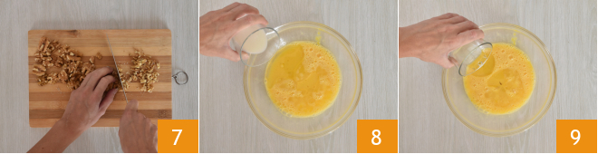 Por último, pique con un cuchillo las nueces 7 y pase a los ingredientes líquidos. En otro bol rompa los huevos y vierta la leche 8, el aceite de semillas 9