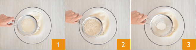 Para preparar los pastelitos de castañas empezamos tamizando en un bol la harina 00 1, la harina de castañas 2 y la levadura para dulces 3.