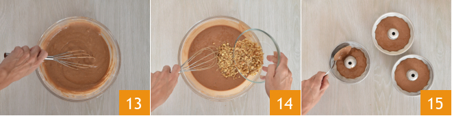 Vierta la segunda parte y continúe mezclando hasta obtener una mezcla compacta pero lisa 13. Agregue también las nueces y dé una última mezclada 14. Transfiera la masa a 4 moldes para rosquillas de 13 cm ya enmantequillados y enharinados 15.