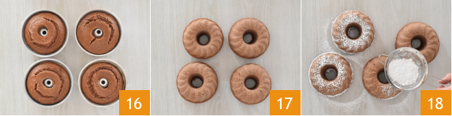 Hornee en horno ya caliente en modo ventilado, a 170° durante unos 25 minutos 16. Una vez cocidos los pastelitos, sáquelos del horno y déjelos enfriar completamente y luego sáquelos de los moldes 17. Antes de servir, espolvoree la superficie de sus pastelitos de castañas con azúcar glas a gusto 18.