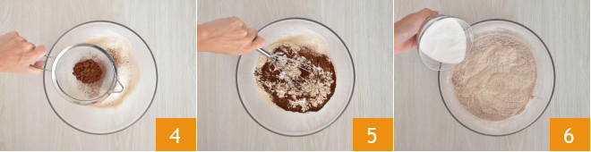 Agregue el cacao 4 y una vez tamizado todo, mezcle para uniformar 5. Finalmente, agregue una pizca de sal y el azúcar, mezcle nuevamente 6.