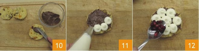 Ahora toma cada disco de panettone, rellénalo con Nutella® 10. Exprime encima unos copos de crema 11 para cubrir toda la superficie. Añade algunos granos de granada 12