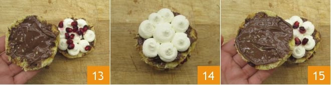 y continúa con una segunda capa igual, es decir, rellena con Nutella® 13, los copos de crema 14 y la granada. Continúa con una tercera y última capa, siempre rellena con Nutella® 15,