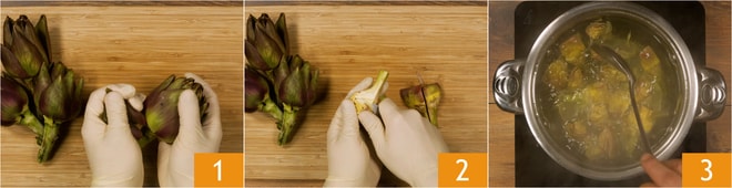Para realizar la receta de los pastelitos de ricotta y alcachofas, primero hay que limpiar bien las hortalizas: eliminad las hojas más externas 1, luego quitad las puntas más duras, cortadlas en cuartos y eliminad la pelusa de su interior 2. Coced las alcachofas en abundante agua salada durante unos 10 minutos desde que hierva 3, deben quedar tiernas.