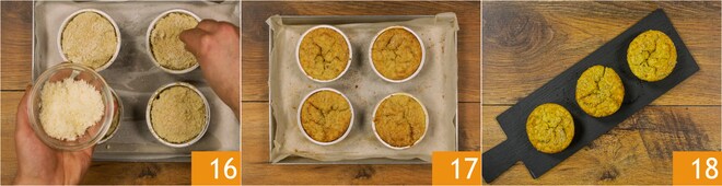 Terminad espolvoreando el queso restante en la superficie 16. Coced en horno estático precalentado a 190°C durante 30 minutos o hasta que estén bien dorados. Desmoldad los pastelitos de ricotta y alcachofas 17 y servidlos templados 18.