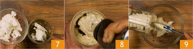 Añadid también la ricotta de oveja 7 y batid todo bien con la batidora de inmersión 8. Verted la crema en un bol 9.