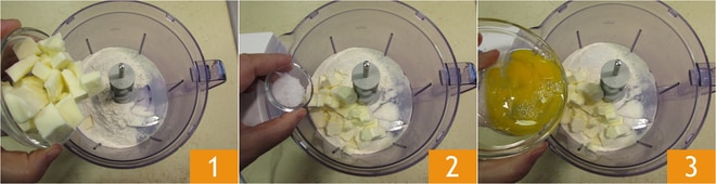 Para preparar los pastelitos salados con robiola empezad con la base, la pasta brisa salada: en un procesador de alimentos verted la harina y luego añadid la mantequilla fría de nevera en trocitos 1, la sal gruesa 2 y el huevo 3.