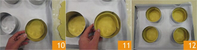 Colocad los discos de 10 cm sobre una bandeja de horno, insertad las bases de pasta brisa 10 y cread los bordes con las tiras 11 12.