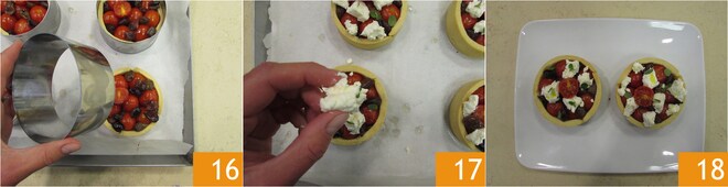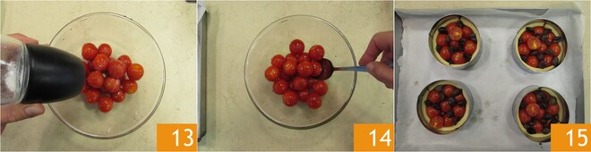 Aliñad con un chorro de aceite y sal los tomatitos enteros 13 y mezclad bien 14. Colocad los tomatitos dentro del casquillo de pasta hasta llenarlo. Terminad con las aceitunas taggiasche 15 y coced en horno estático a 200° durante 20-25 min hasta que la pasta esté dorada.