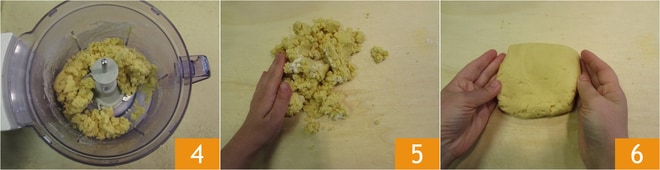 Cerrad con la tapa y accionad el procesador hasta obtener una mezcla arenosa 4. Transferid la mezcla a una superficie de trabajo 5 y trabajadla rápidamente con las manos para formar un bloque 6.