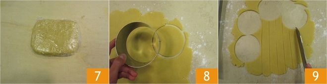 Envolved el bloque en film transparente y dejadlo reposar en el frigorífico al menos una hora 7. Pasado este tiempo, extendéis la pasta brisa salada sobre una superficie ligeramente enharinada hasta un grosor de aproximadamente ½ cm. Recortad 4 bases de 10 cm de diámetro 8, luego cortad tiras de 3 cm que utilizaréis como borde 9.