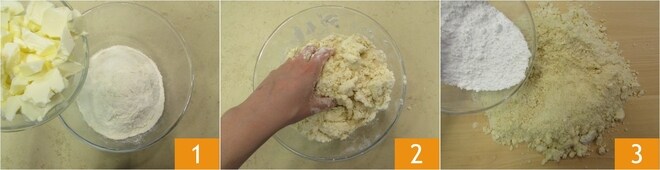 Para preparar los pasticciotti con crema de arroz, lo primero que debéis hacer es la masa. En un bol, verted la harina y la mantequilla fría en cubos 1, trabajadlos bien con las manos hasta obtener un compuesto "arenoso". Trasladadlo a una superficie lisa y añadid el azúcar glas 3.
