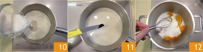 Mientras tanto, ocupémonos de la crema: verted la leche de arroz en un cazo 10, añadid las semillas de vainilla 11 y llevad casi a ebullición. En otro cazo, verted los huevos, la yema y el azúcar; mezclad con un batidor 12, hasta obtener un compuesto bien amalgamado.