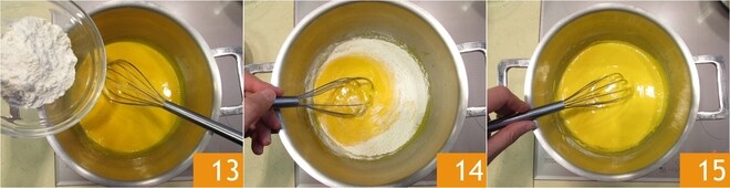 Añadid la harina 13, mezclad e incorporad también la maicena 14. Amalgamad bien con el batidor. Debéis obtener un compuesto liso y sin grumos.