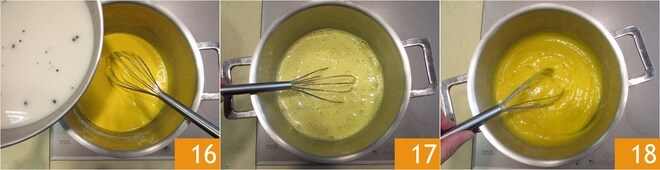 En cuanto la leche empiece a hervir, vertedla lentamente en el compuesto de yemas 16, continuando a mezclar. Coced a fuego bajo, mezclando siempre, hasta que la crema alcance la consistencia deseada 18.