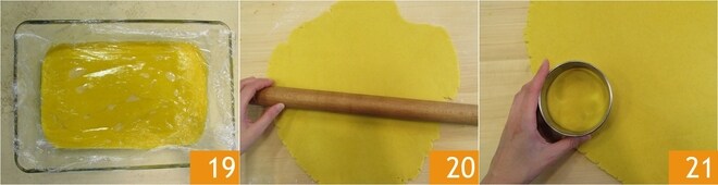 Trasladadla a una fuente y cubridla con film en contacto 19. Recuperad la masa y estiradla con la ayuda de un rodillo. Debéis obtener un espesor de medio cm 20. Utilizando un cortapastas redondo de 10 cm, cortad el primer disco 21, necesitaréis 24.