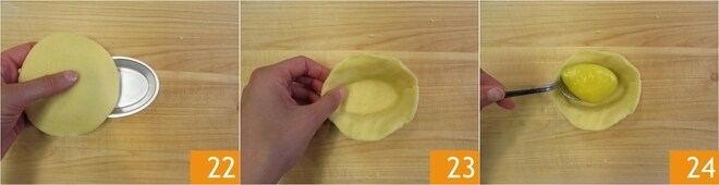 Trasladadlo al interior de un molde ovalado grande de 6,5 x 10 cm. Haced que se adhiera bien a los bordes presionando con los dedos 23 y rellenad con la crema casi hasta el borde 24.