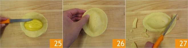 Cortad con un cuchillo la masa sobrante 25 y colocad encima otro disco de masa. Presionad bien en los bordes para que se adhiera 26 y eliminad nuevamente el exceso de masa con un cuchillo 27. Continuad de esta manera hasta formar 12 pasticciotti.