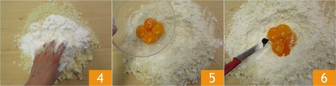 Mezclad con las manos 4 y formad un volcán. Verted en el centro las yemas 5 y las semillas de la vaina de vainilla 6.