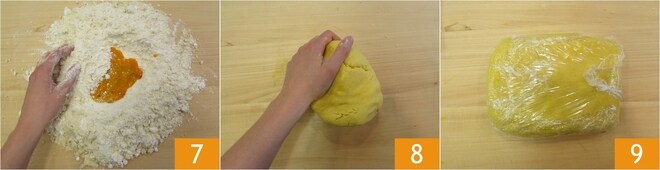 Amasad rápidamente con las manos 7 hasta obtener una masa lisa y homogénea 8. Envolvedla en film 9 y dejadla reposar en el frigorífico.