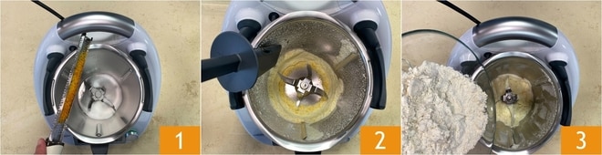 Para preparar la pastiera napolitana con Bimby®, comienza con la pasta frolla: coloca en el vaso el azúcar y la cáscara rallada del limón y de la naranja 1, luego pulveriza durante 10 segundos a velocidad 10. Reúne todo en el fondo con una espátula 2 y repite la operación durante otros 10 segundos, siempre a velocidad 10. Luego añade la harina 00 3.