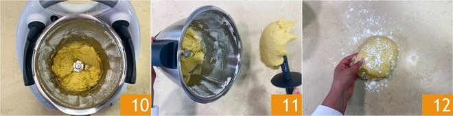 Una vez listo 10, transfiere la masa a una superficie de trabajo ligeramente enharinada 11 y compáctala con las manos, formando un bloque liso 12.