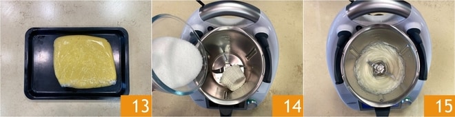 Envuelve el bloque en film transparente y colócalo en el frigorífico durante al menos 6 horas antes de continuar 13. En un vaso limpio y seco, coloca la ricotta de oveja y el azúcar 14, luego mezcla durante 30 segundos a velocidad 4 15.