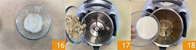 Transfiere la mezcla a un bol, cúbrela con film transparente en contacto directo 16 y colócala en el frigorífico durante 6 horas. En el vaso limpio, vierte el trigo cocido 17 y la leche 18.