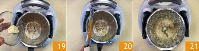 Agrega la mantequilla 19 y la cáscara rallada del limón y de la naranja 20, luego cocina durante 20 minutos a 80° a velocidad 1 en sentido contrario a las agujas del reloj. Transcurrido este tiempo, bate durante 15 segundos a velocidad 8 21.