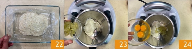 Transfiere la mezcla a un bol y cúbrela con film transparente 22, luego déjala reposar. Transcurrido el tiempo de reposo de la ricotta, introdúcela en el vaso junto con el cedro confitado 23, añade también 2 huevos enteros y 1 yema 24.