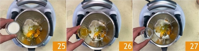 Vierte también la leche 25, la miel 26 y el agua de flores de naranjo 27, luego mezcla durante 1 minuto a velocidad 4 en sentido contrario a las agujas del reloj.