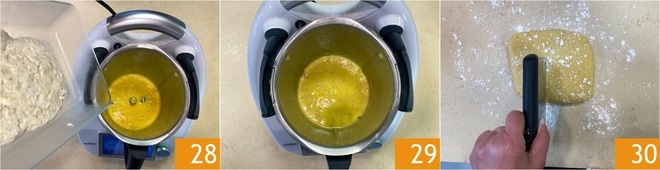Agrega el trigo cocido bien enfriado 28 y mezcla durante un minuto adicional a velocidad 3 en sentido contrario a las agujas del reloj. Deja la mezcla en el vaso hasta el momento de utilizarla 29. Precalienta el horno a 180° en modo estático. Retira la pasta frolla del frigorífico y divídela en 2 partes, una ligeramente más grande que la otra 30.
