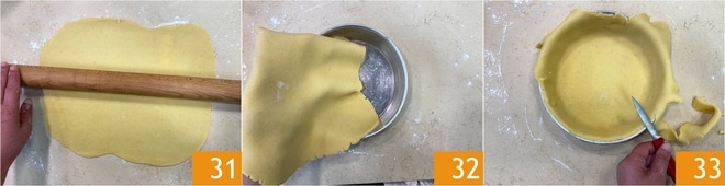 Extiende la parte más grande con un rodillo sobre una superficie ligeramente enharinada, hasta alcanzar un grosor de aproximadamente 3 mm 31. Enrolla la frolla en el rodillo y desenróllala sobre un molde acampanado para pastiera de 20 cm (no es necesario engrasar y enharinar el molde) 32. Haz que la frolla se adhiera bien al fondo y los bordes, luego elimina el exceso pasando el rodillo y recortando con un cuchillito 33.