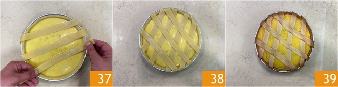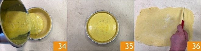 Vierte la crema preparada dentro de la cáscara de frolla 34, luego golpea suavemente el molde sobre la superficie de trabajo para eliminar posibles burbujas de aire 35. Extiende la parte restante de masa y córtala en 7 tiras de 1-2 cm de ancho 36.