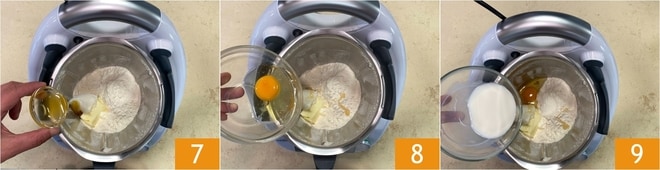 Finalmente, vierte la miel 7, el huevo 8 y la leche 9. Amasa durante 30 segundos a velocidad 5.