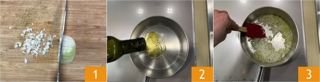 Para preparar la pastina al tomate, limpia la cebolla y pícala 1. En una cacerola calienta el aceite 2 y añade la cebolla 3, una pizca de sal y deja que se dore.