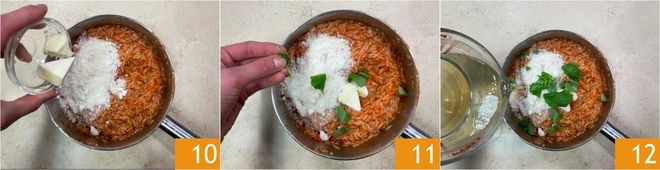 Una vez cocido, mezcla con el queso y la mantequilla fría 10, aromatiza con hojas de albahaca 11 y, si es necesario, añade un poco más de caldo 12, lo suficiente para hacer el plato cremoso.