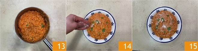 La pastina al tomate está lista 13, saboréala con una espolvoreada de Parmigiano Reggiano rallado 14 al gusto y sírvela inmediatamente en la mesa 15.