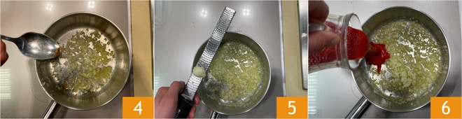 Añade también la guindilla 4 y los tallos de albahaca, en cuanto la cebolla esté translúcida añade el ajo rallado 5. Sofríe un poco más para ablandarlo. Vierte el puré de tomate 6.