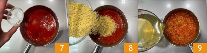 Condimenta con sal y una pizca de azúcar (opcional) 7. Cocina 5 minutos con tapa a fuego lento, removiendo de vez en cuando. Vierte los arroces 8, cubre con el caldo caliente 9 y lleva a cocción removiendo como si fuera un risotto. Remueve de vez en cuando.