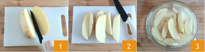 Para preparar las patatas al horno con piel, primero lava bien las patatas bajo agua corriente. Corta las patatas primero por la mitad 1 y luego en gajos de un grosor máximo de medio centímetro 2. Traslada los gajos a un bol grande, cubre con agua fría y deja en remojo durante 20 minutos para que pierdan parte del almidón 3.
