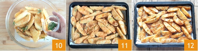 Añade también el romero 10 y mezcla de nuevo. Distribuye las patatas así condimentadas en una bandeja forrada con papel de horno, procurando no superponerlas 11. Hornea en horno estático precalentado a 200° durante aproximadamente 40-45 minutos. Cuando estén bien doradas y crujientes, retira del horno y sirve inmediatamente tus patatas al horno con piel 12!