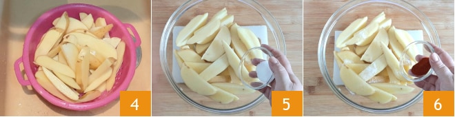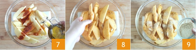 Transcurrido el tiempo de remojo, escurre las patatas 4 y sécalas con un paño o papel de cocina, luego ponlas en un bol y sazona con sal 5 y pimentón 6.