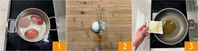 Para preparar las patatas duquesa con espinacas, pongan las patatas enteras con piel en agua fría con sal 1 y déjenlas cocinar por unos 30-35 minutos desde que hierva, controlando la consistencia con los dientes de un tenedor. Mientras tanto, limpien y piquen la cebolla 2. En una sartén antiadherente, viertan un chorrito de aceite y la cebolla picada 3, luego sofrían a fuego lento hasta que la cebolla esté suave.