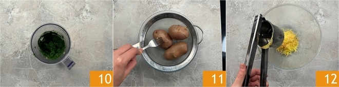 Deben obtener un puré homogéneo 10. Luego déjenlo enfriar. Escurran las patatas cocidas 11 y pásenlas, aún calientes, por el pasapurés 12.